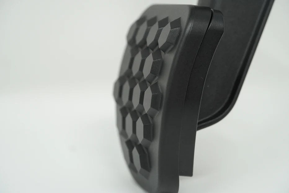 In developing our pedals, our goal was to create not only the best-looking but also the most functional pedals on the market. Our patented Hex Design maximizes grip and aesthetics, offering a sleek, modern look with unparalleled traction. A common complaint about Porsche OEM pedals is their thin and flimsy construction. We addressed this by widening our pedals, providing more surface area for the driver’s foot and facilitating smoother transitions between gas and brake. Crafted from hardcoat anodized billet aluminum, our pedals ensure no flex or wear. These performance pedals give drivers ultimate confidence, knowing they have the best durability and response on the road.