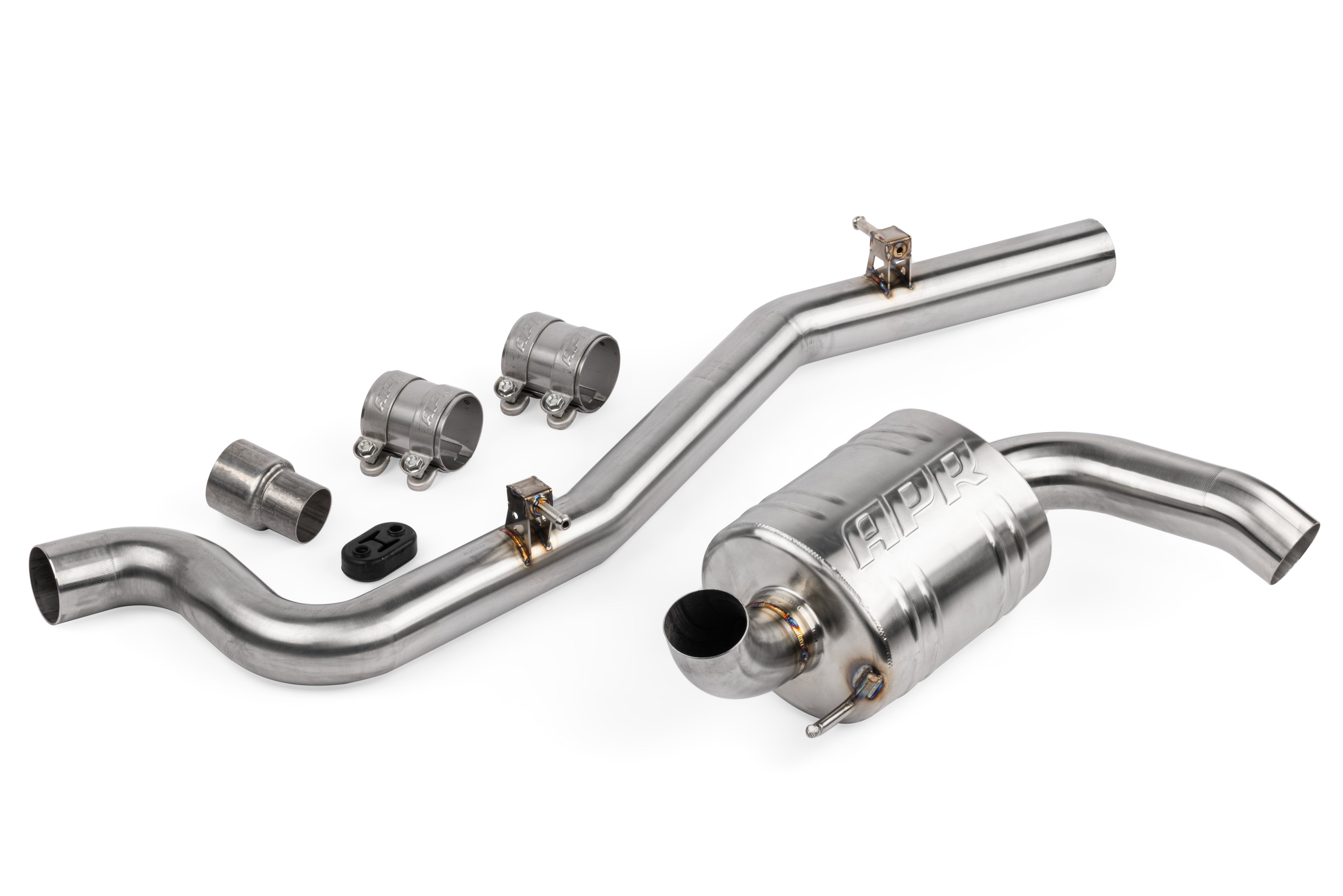 The APR Catback Exhaust System personalizes your vehicle's sound and performance. Beautifully hand-crafted T304-stainless-steel components adorn the system with stunning TIG-welding throughout. Our straight-through brushed-finished muffler smooths the exhaust note to a deep growl, without adding restrictions, rasp or drone. Strong high-quality bracketry and OEM-style clamps hold the system steadily in place, making the install or removal a snap, and fitment simple, yet precise. The full 3" tubing creates an ultra-smooth exhaust path, steadily feeding exhaust gasses out of the system, while looking tidy from under the rear bumper. Finally, the hidden 3" exhaust exit creates a clean finish that matches the factory exhaust exit strategy.