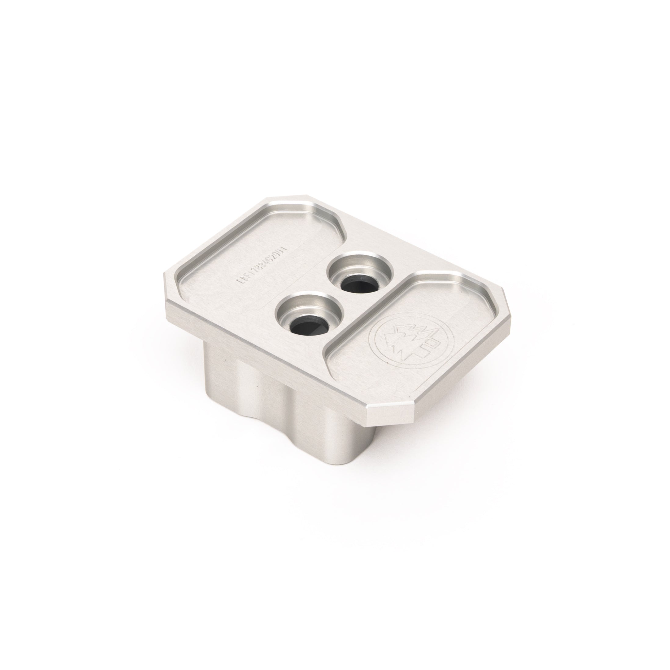 Installation is simple once you're underneath the vehicle - simply remove the two 10mm triple square bolts holding the factory plate, slide in our billet insert, re-install the 10mm triple square bolts (blue loctite is recommended) and torque to 20Nm.