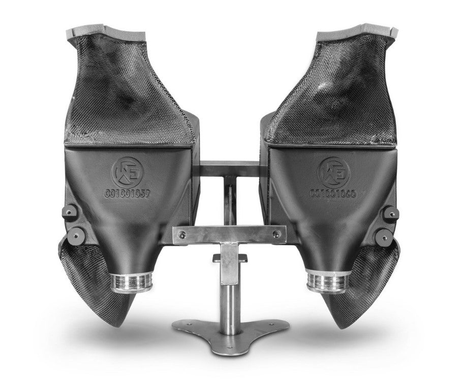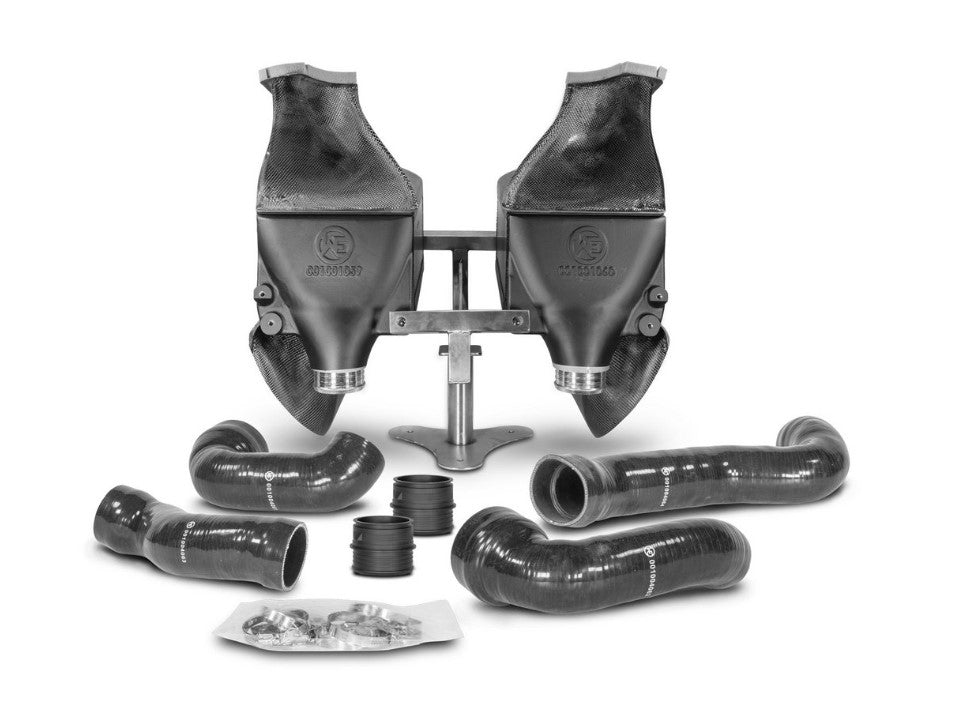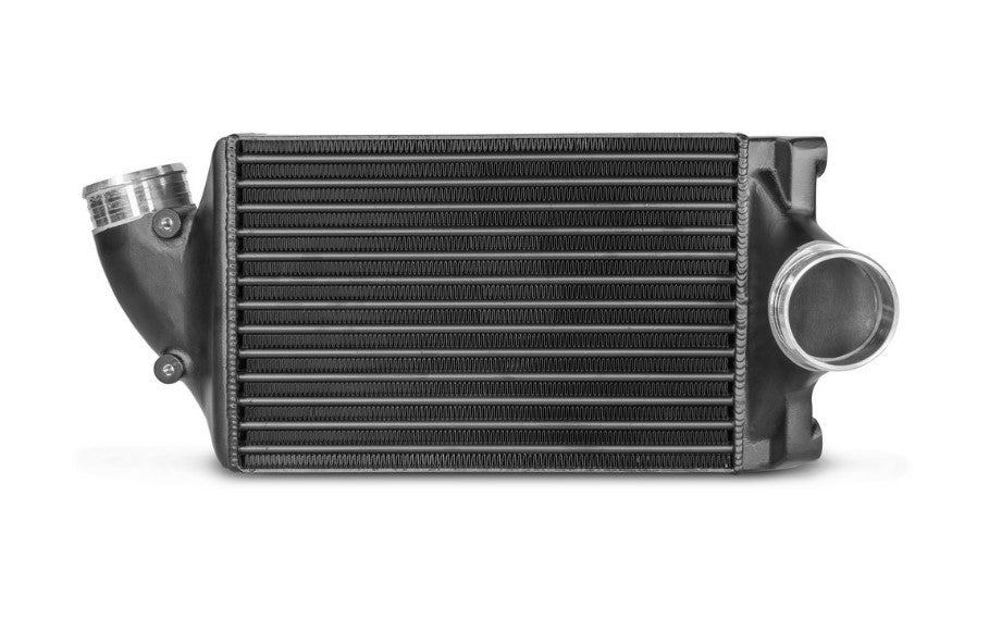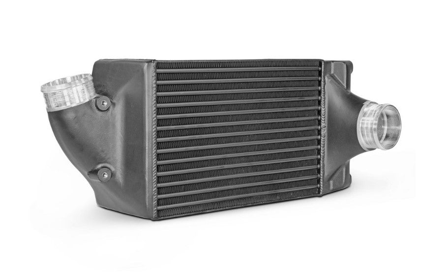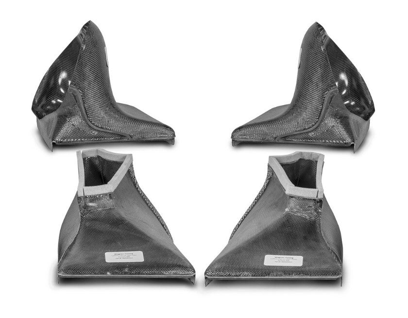 The Wagner Tuning EVO 2 high-performance intercoolers (2 x [330mm x 222mm x 145mm] = 21,244cc) is designed to provide a whopping 77% more charge air volume than the factory intercoolers. This translates into a significant increase in your vehicle's performance. Our specially designed Competition high performance intercooler core ensures excellent cooling characteristics. Even under extreme conditions, your engine will maintain the optimum temperature. CAD designed cast aluminum freeform end boxes provide the best possible internal airflow and high pressure resistance of up to 6 bar (tested). Our kit includes a custom-fit carbon air duct that ensures the intercooler is optimally supplied with fresh air. This is crucial for maximum performance of your vehicle. The kit includes additional silicone hoses with an enlarged cross-section to optimize airflow. Our intercoolers are finished with an anti-corrosion coating that not only ensures durability, but also provides excellent heat conduction properties. Our kit comes complete with new carbon air guides, silicone hoses and aluminum adapters. Installation is simple and replaces the factory intercoolers. This kit is specifically designed for racing and features a 70mm intake and exhaust for maximum performance.