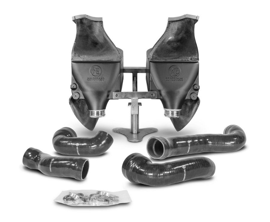 CAD designed cast aluminum freeform end boxes provide the best possible internal airflow and high pressure resistance of up to 6 bar (tested). Our kit includes a custom-fit carbon air duct that ensures the intercooler is optimally supplied with fresh air. This is crucial for maximum performance of your vehicle. The kit includes additional silicone hoses with an enlarged cross-section to optimize airflow. Our intercoolers are finished with an anti-corrosion coating that not only ensures durability, but also provides excellent heat conduction properties. Our kit comes complete with new carbon air guides, silicone hoses and aluminum adapters. Installation is simple and replaces the factory intercoolers. This kit is specifically designed for racing and features a 70mm intake and exhaust for maximum performance.