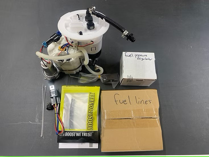 This kit comes with a fully assembled Low Pressure Fuel Pump, and all the necessary hardware, including cable ties, wires, fuel lines, and a regulator) to install in your vehicle.