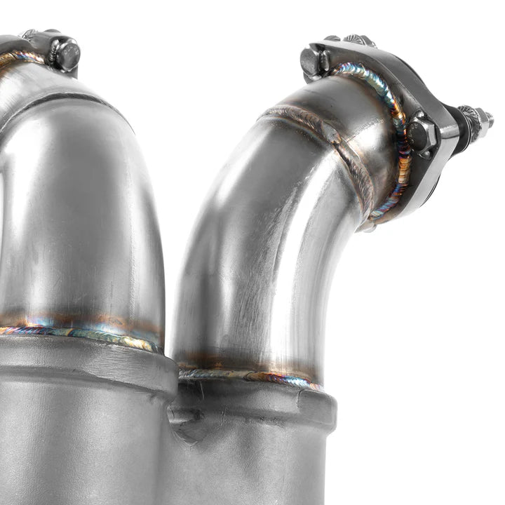 IE downpipes are manufactured with quality materials for lasting strength and performance. The T304L stainless steel investment cast body smoothly transitions exhaust flow from the massive 6" CAT to the dual 2.5" mandrel bent exhaust legs. All joints are hand TIG welded using precise fixtures and tooling for a seamless, leak-free fit.