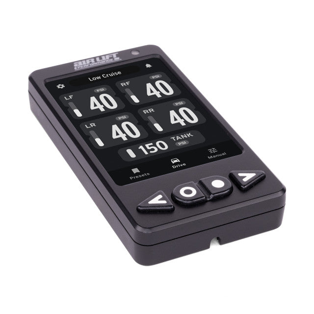 The ALP4 air management system redefines what’s possible for air suspension control, combining cutting-edge hardware with smarter, more seamless functionality. This system features a compact, all-in-one manifold, which houses the ECU, solenoids, and pressure sensors, crafted from anodized black billet aluminum for durability and a sleek, show-ready appearance. Paired with a full-color touchscreen controller framed in anodized aluminum and equipped with four tactile physical buttons, this system offers immediate control for your presets, 4-corner manual control, axle adjustments, full air-out and other adjustable functions. With mobile app integration, ALP4 allows you to use and fine-tune your setup from anywhere, ensuring ultimate control.