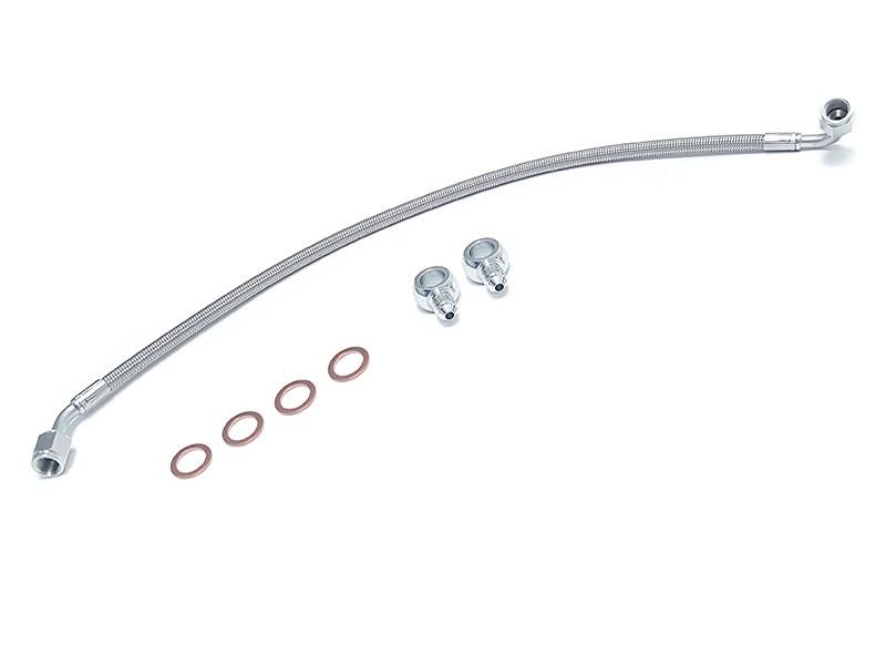 NM Eng Turbo Oil Line features stainless steel braided line with properly clocked banjo ends. This oil line fixes the very common oil leak coming from the factory hard line. A must 'while-you're-at it' upgrade every time you remove the bumper to access the turbo, replace water pump housing, or upgrading your intercooler. Unaddressed turbo line leak can cause a huge mess, starvation to the turbo, and even fire when the oil drips onto the catalytic converter (hottest part on the entire car).