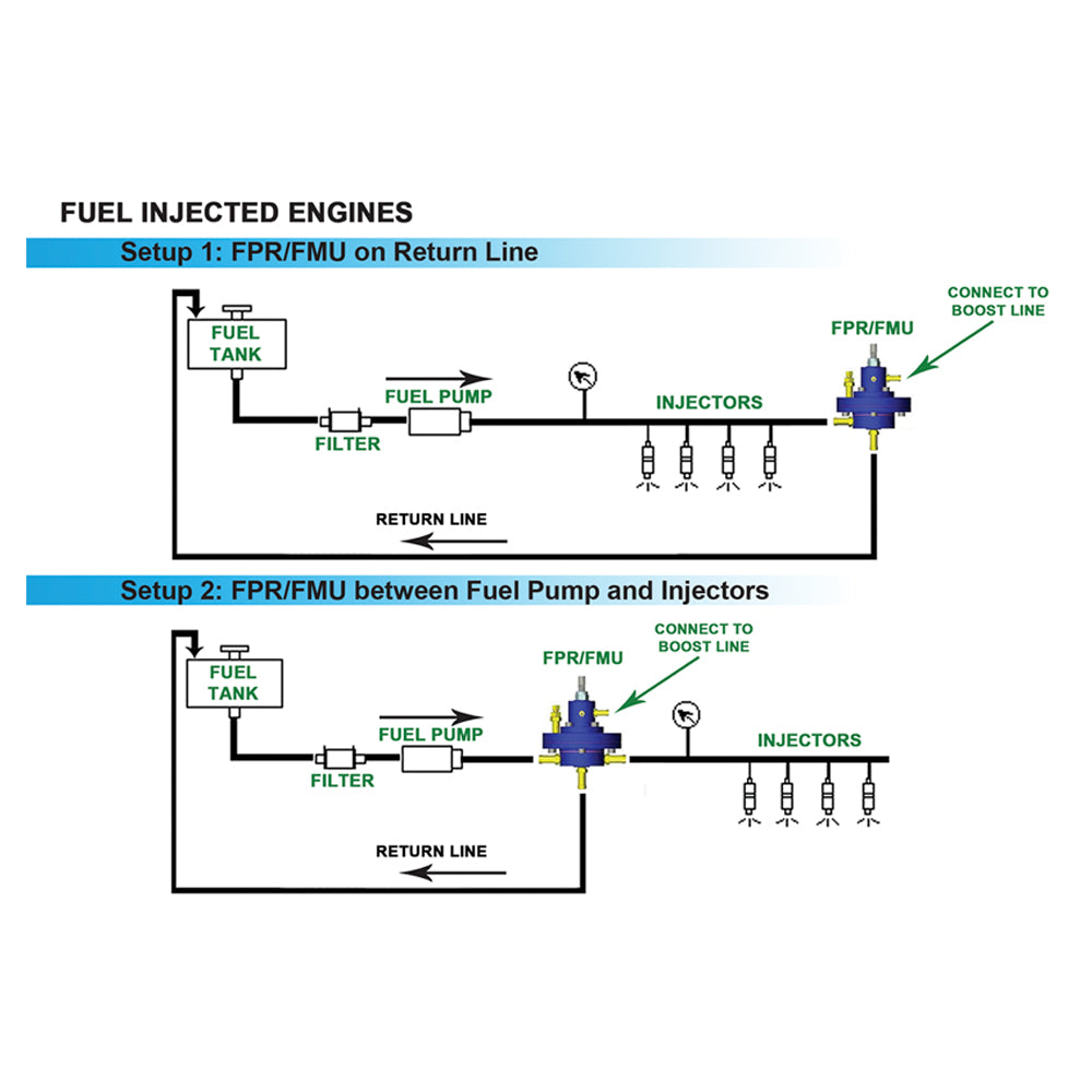 - The composite FPR line are designed to easily adapt to a fuel system, using hoses and clamps. Internally, the regulators use a special diaphragm seal that guarantees safety and quality. The 10 to 100 psi universal FPR, with 1:1 boost reference can be adjusted to meet the needs of most of fuel injections systems, the carburetor FPR has a 0 to 30 psi range. Our FMU has a adjustable 1:14 raising rate that allows you to fine tune the fuel pressure that you will need according to you engine boost pressure.