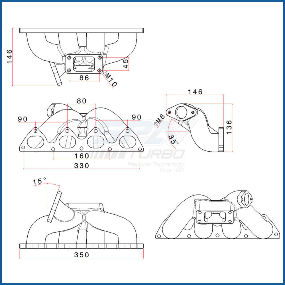 - SPA Turbo exhaust manifolds are precision CNC machined from high quality ASTM 536 60-40-18 cast iron.