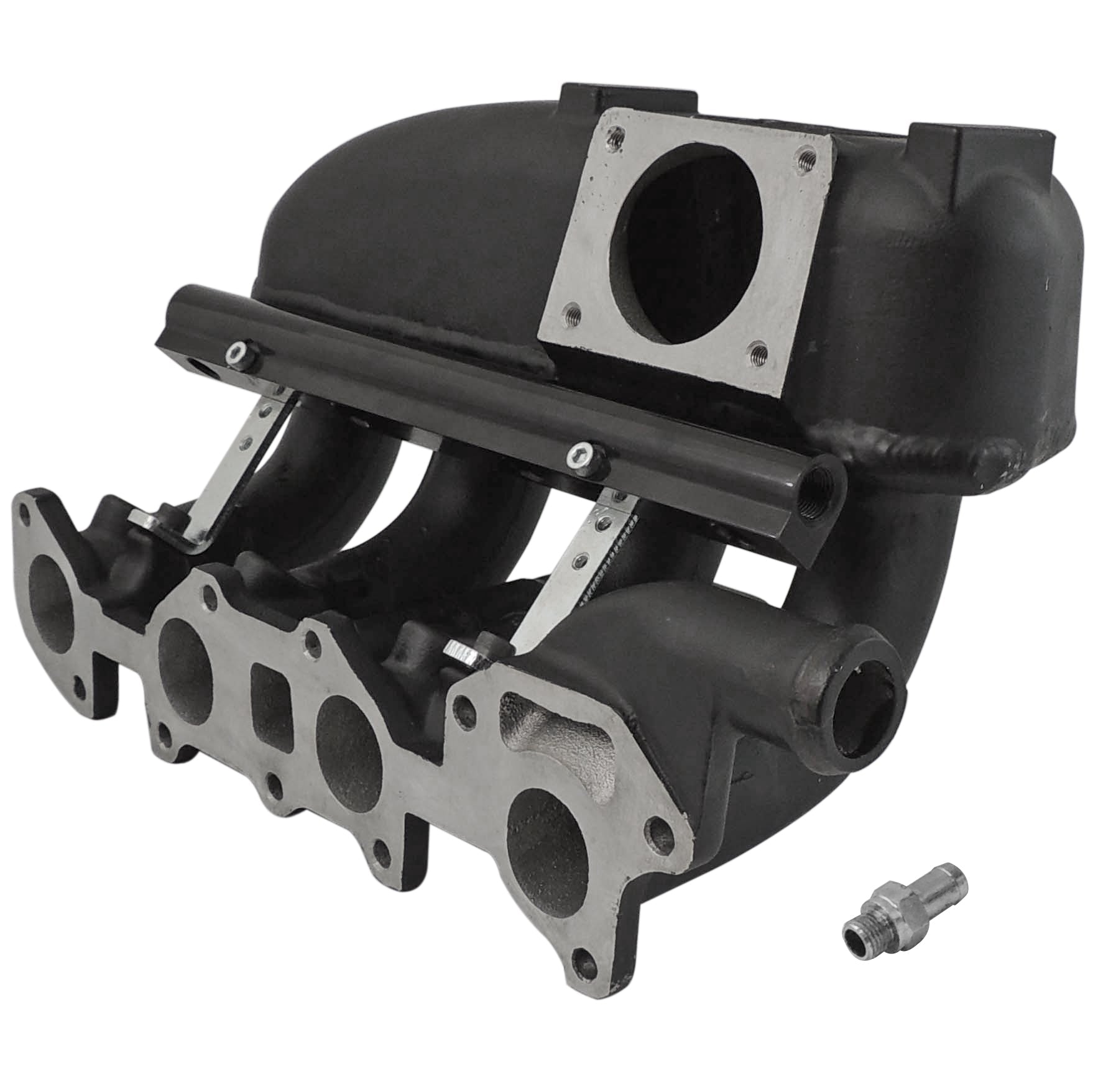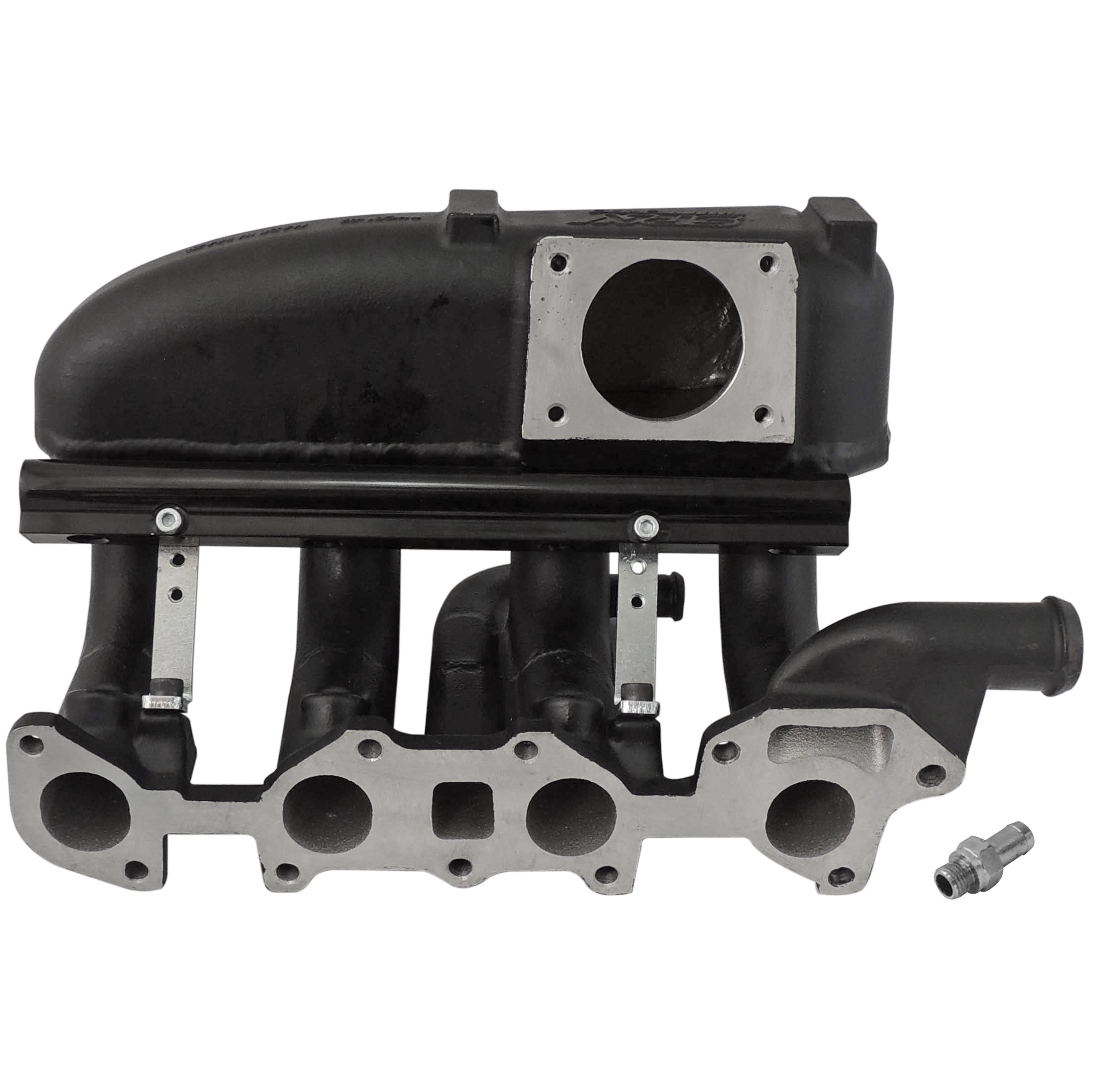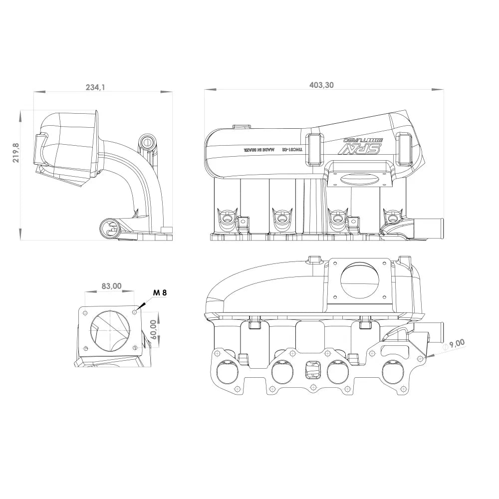 SPA Turbo brings to the high performance market the new plenum intake manifold for Chevy Chevette / Pontiac T1000 / Acadian with OHC engine (1.4 and 1.6L) for installation of electronic injection. Made of cast aluminum and designed by the SPA Turbo engineering department, this manifold combines durability, as it has no welds in its construction, with high efficiency and the highest flow on the market, thanks to studies in a flow bank. The angle of the 4 duel injector was properly weighed to ensure the best use and atomization of the fuel (see image). Available with center or forward TBI (ideal for use with intercooler). It can be used in aspirated engines only for conversion from carburettor to injection. It has all water circulation entries in the original pattern.