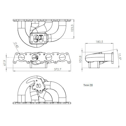- The TMA05 manifold is a GGG40 cast manifold, with a T3 turbocharger Flange; manifold accepts 2-bolt 38mm wastegates.